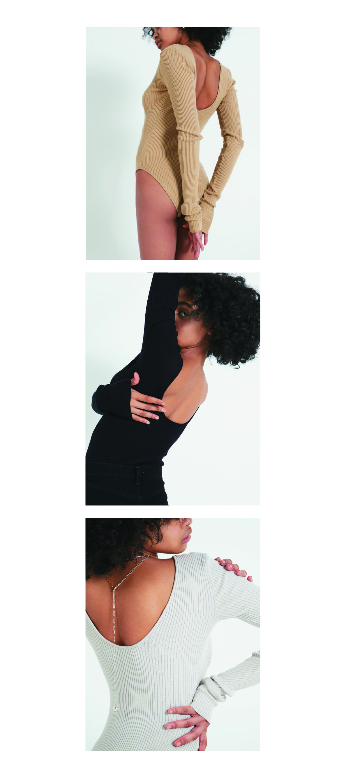後ろ身頃が大きく開いたニットボディスーツ。